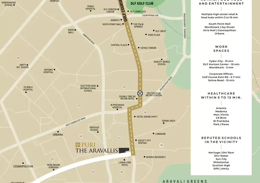 Puri The Aravallis Sector 61 Gurgaon, Golf Course Extension Road by Puri Constructions creates a modish housing with the latest designs, high range of modern amenities and eco friendly ambience spur the beauty of this 10.4 acres of housing (total 320 units) and bring families together to outspread the wings of Luxury & Comfort.
